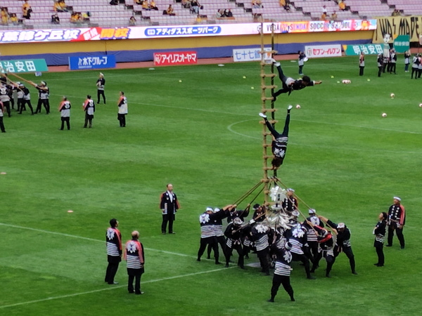 試合前には、エントランスでの高速さんバンドの演奏、仙台市消防団階子乗り隊の見事な演技、陸自ヘリからのセンターサークル内への記念ボール投下など、お祭り気分での試合前だったが、あと一歩ゴールを割れず、痛い敗戦。